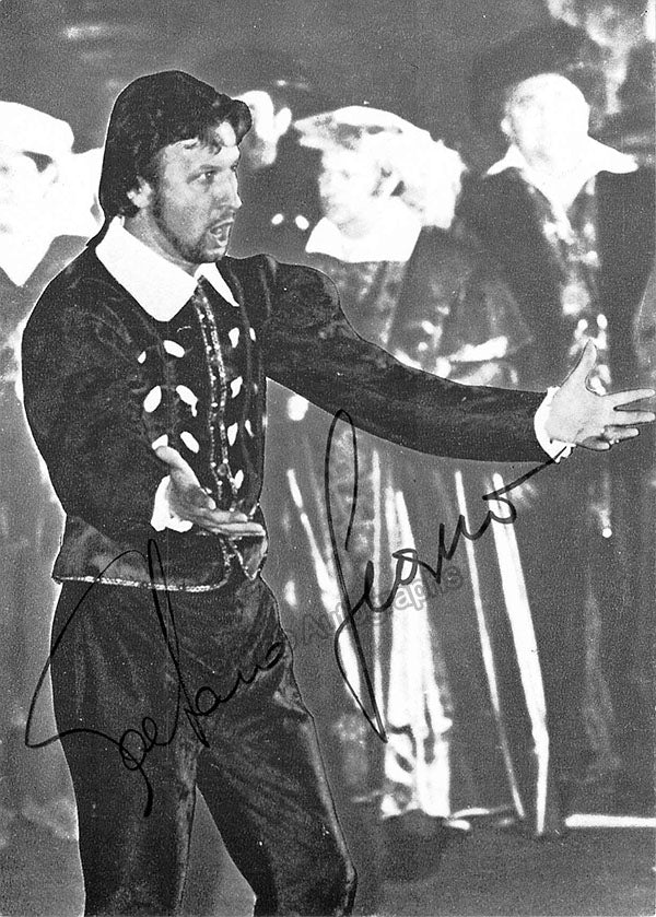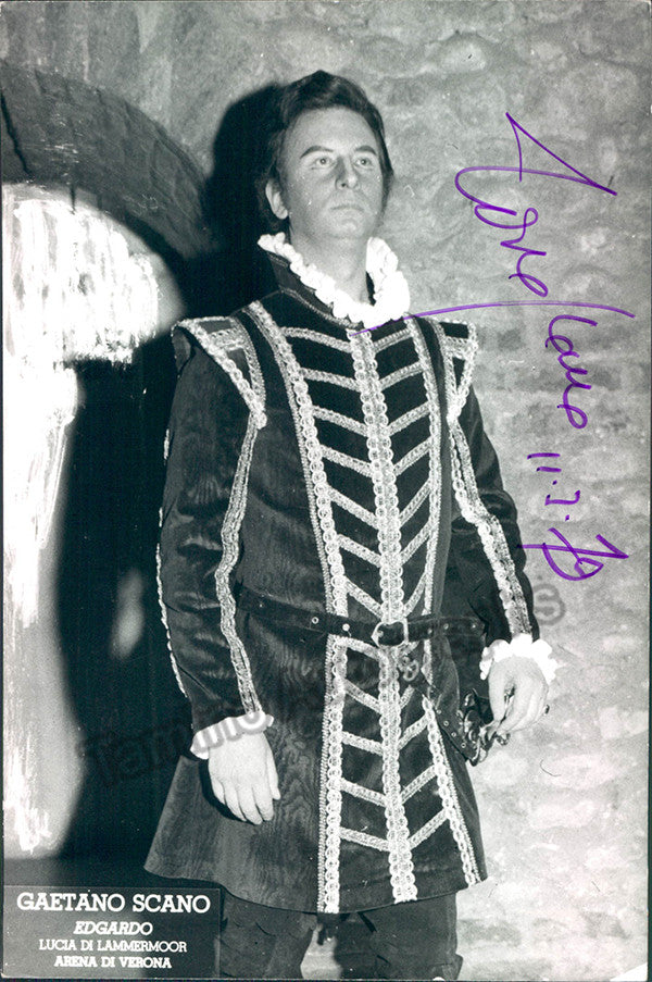 Signed photograph, shown as Edgardo in Donizett's Lucia di Lammermoor, dated in 1979. Size is 4.75 x 7 inches.