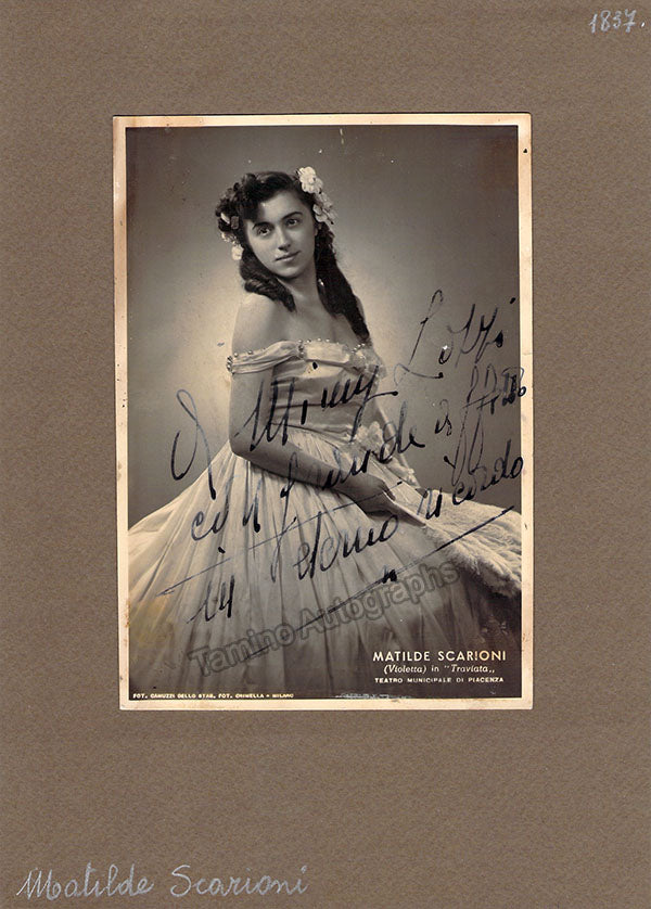 Italian soprano, signed photograph, shown as Violetta in Verdi's La Traviata, inscribed. Photo by Camuzzi, Milan. This is a 4 x 6 inch photo mounted on soft cardboard, total item size is 6.5 x 9 inches, some rust, otherwise in very good condition.