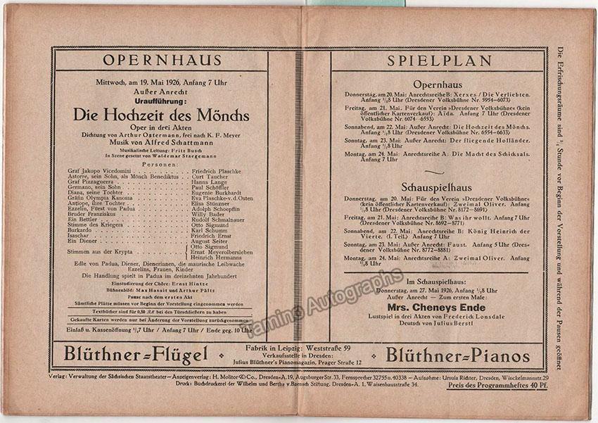 Unsigned program for the world premiere of Schattmann's opera "Die Hochzeit des Monchs" at the Dresden Opera House, on May 19th, 1926, starring Friedrich Plaschke, Eva Plaschke-van-der Osten, and Hanns Lange, under the baton of Fritz Busch.  Size is 6.25 x 8.7 inches, full program with all pages and covers, minor rust stains on covers, otherwise in excellent condition.