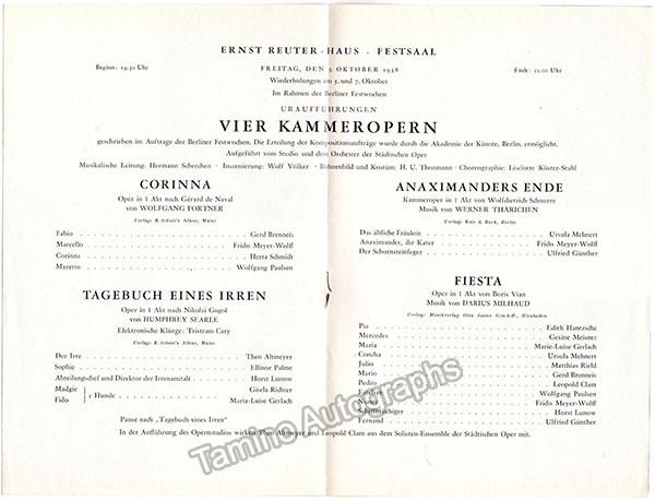 Program for four world premieres by Wolfgang Fortner, Darius Milhaud, Werner Thärichen, Humphrey Searle. Berlin Festival, October 16th, 1958. Conductor: Hermann Scherchen. Size is 6 x 9 inches, in excellent condition