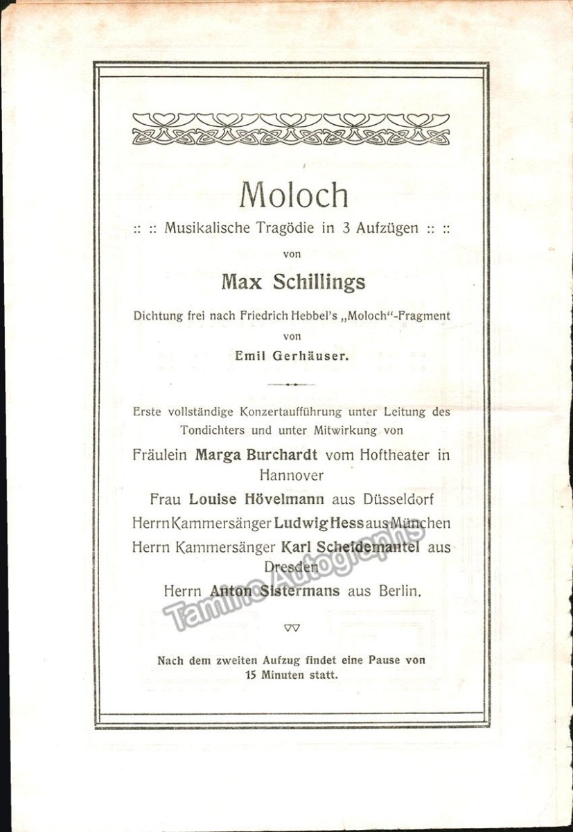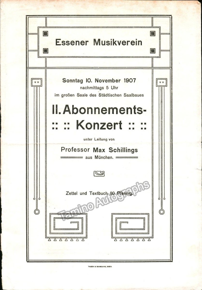 Concert program conducting his own music - Essen, 10. November 1907, Conductor: Max von Schillings. Soloists: Marga Burchardt, Louise Hovelmann, Ludwig Hess, Karl Scheidemantel, Anton Sistermans Max von Schillings: Moloch (1906), 23 x 15 cm, 4 pages, good condition.