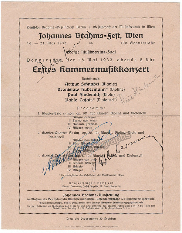 Fabulous 1-page program for the first chamber music concert of the Brahms Festival, Berlin, May 16-21, 1933. Signed by all 4 famous performers, Arthur Schnabel (piano), Pablo Casals (cello), Bronislaw Hubermann (violin) and composer/musician Paul Hindemith (viola).