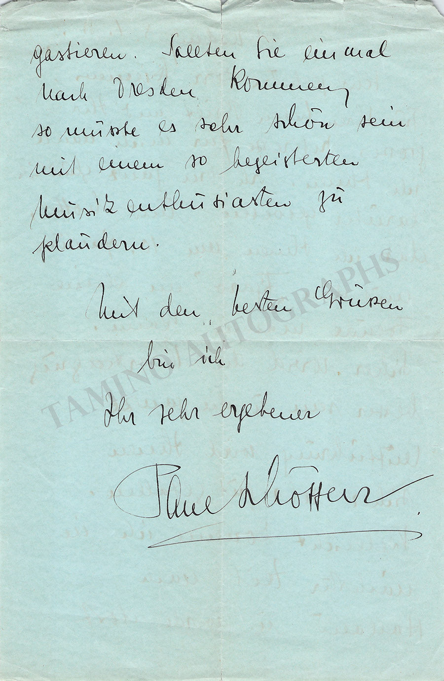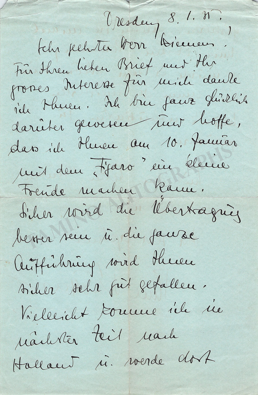 German baritone (1897-1977) known for Mozart, Wagner and Strauss roles, sang frequently at the Vienna State Opera. Autograph letter signed, 2 pages, written in German, sold untranslated. Size is 7.5 x 11.25 inches, small tear at the top and several creases and folds, otherwise in good condition.