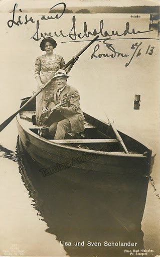 Swedish mezzo-soprano (1884-1974).  Signed photo shown in a boat with her husband Sven, dated in London, 1913. Size 3.25 x 5.5 inches, in very good condition.