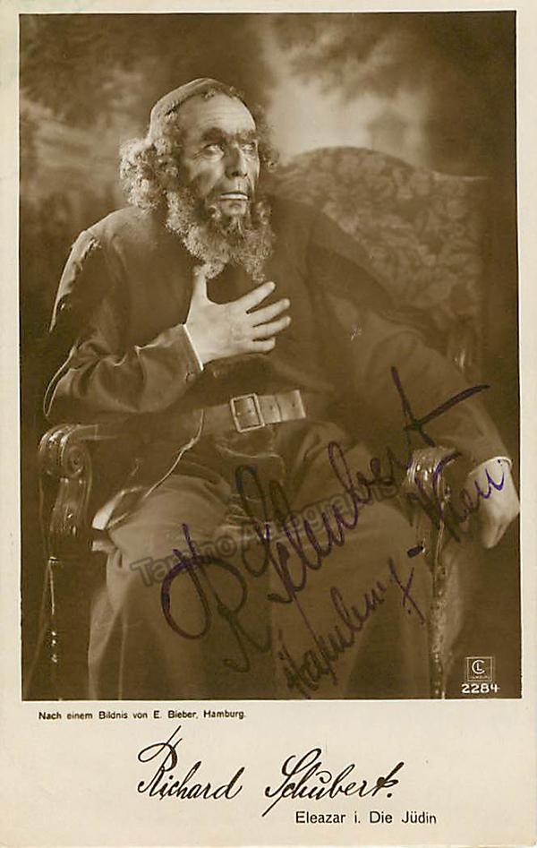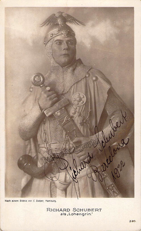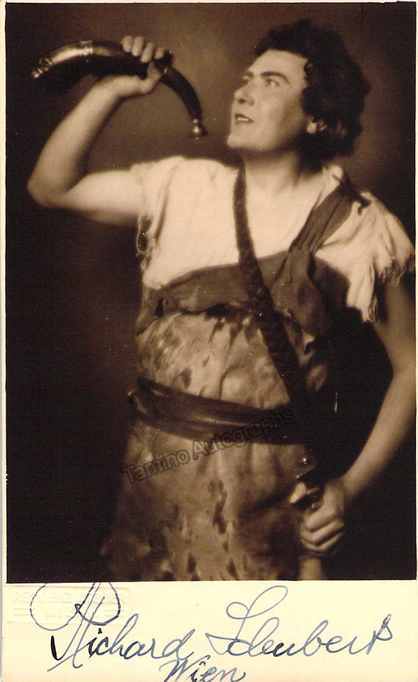 Signed postcard photograph, shown in the title role of Wagner's Siegfried, signed in Vienna. Blind stamped on front by Residenz Atelier photo studio, Vienna. Size is 3.25 x 5.25 inches, in excellent condition.