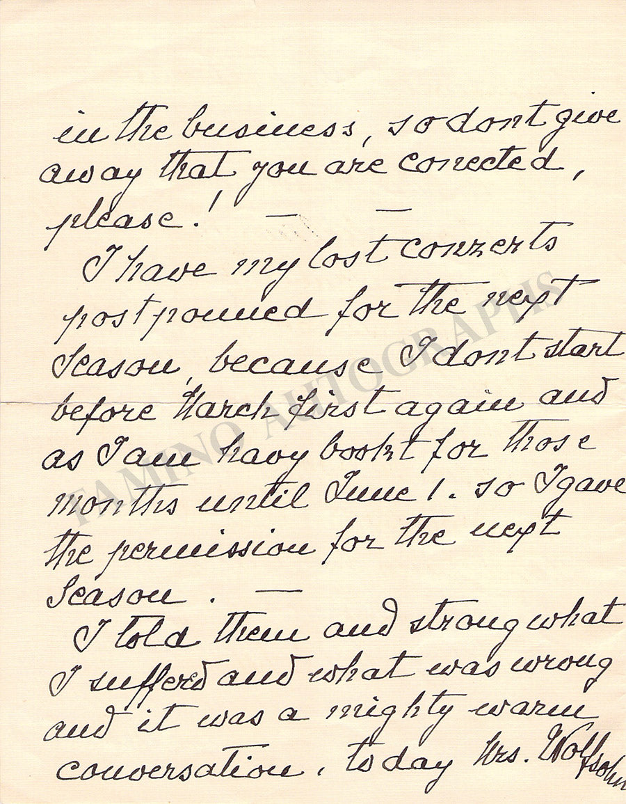 Star German contralto (1861-1936), autograph letter signed, 3 pages, written in English, dated in 1914. Size of each page is 5.25 x 6.75 inches, small tear in middle of the page, otherwise in very good condition.