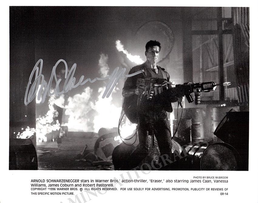 Austrian-American actor, filmmaker, businessman, and former politician and bodybuilder, who served as Governor of California, starred many action movies and is widely regarded as one of the greatest bodybuilders of all time.  Signed promo photo shown in the movie "Eraser" (1996), size is 10 x 8 inches, in excellent condition.