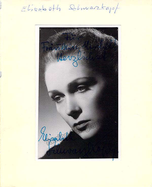 German soprano (1915-2006), signed photo, shown as herself, inscribed. Photo is 3.25 x 5.25 inches mounted onto larger paper, total size is 5.75 x 7.25 inches, in excellent condition.