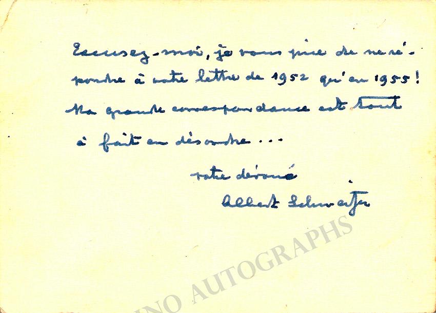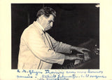 German organist, theologian, philosoper and physician (1875-1965), won the Nobel Peace Prize (1952). Signed photo, shown performing at the organ, inscribed, 5.5 x 4 inches. Photo is also handwritten and signed on verso by him, in French.
