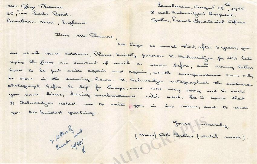 ALSO INCLUDED is a short note by a Miss Silver, a Dutch nurse, on behalf of Schweitzer, dated in 1955, sending the signed photo, in English, 8.25 x 5.25 inches, and the envelope.