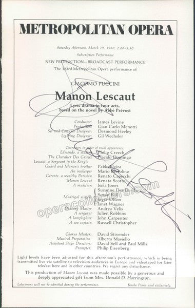 Manon Lescaut at Met Opera, 1980, signed cast page only