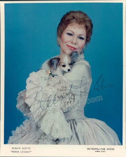 Signed photo of the superstar Italian soprano (b.1934) as Manon in Puccini's Manon Lescaut at the Metropolitan Opera. Size 8 x 10 inches.