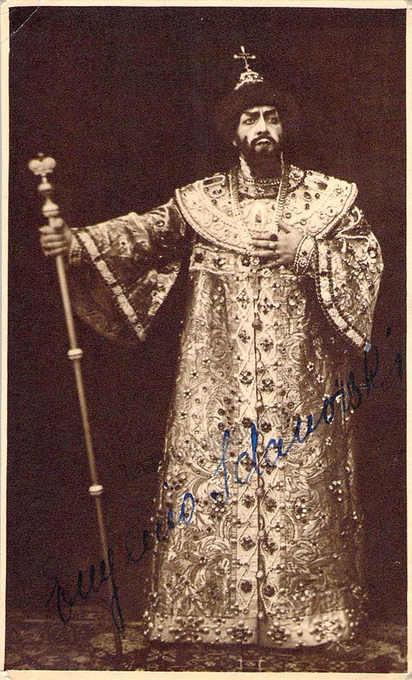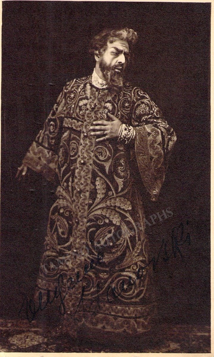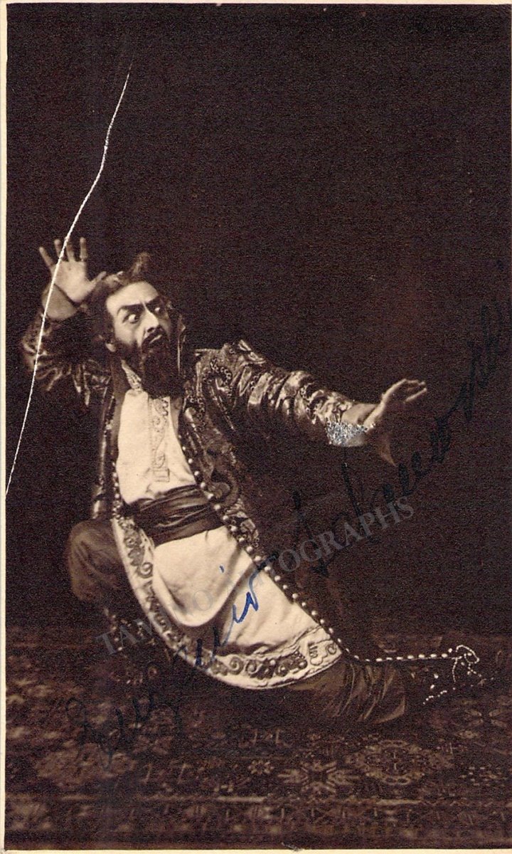 Signed photo postcard, shown in title role of Mussorgsky's Boris Godunov. Stamped on verso by photographer C. Valdemano, Monza. Size is 3.25 x 5.25 inches, in excellent condition.