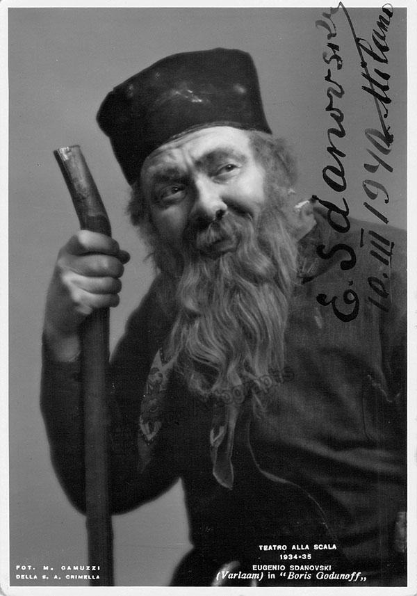 Signed photo postcard, shown as Varlaam in Mussorgsky's Boris Godunov, signed in Milan, dated in 1940. Blind stamped by photographer M. Camuzzi, Milan. Size is 4 x 6 inches, in excellent condition.