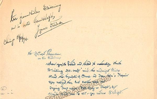Russian violin virtuoso (1899-1962) and Polish pianist and composer (1882-1948). Signed album page with a music quote with 3 bars of music from an unknown piece, with a short sentiment, dated in Chicago, 1920. Also signed on verso by the Polish pianist dated in Chicago, 1991. Size is 9.1 x 5.75 inches, in very good condition.