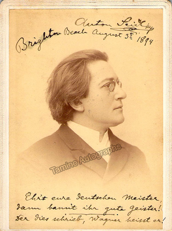 Beautiful cabinet photograph of the conductor, signed and inscribed by him with a short sentiment, dated in Brighton Beach (Brooklyn, New York) in 1894.  Photograph by Wilhelm, New York. Size is 4.25 x 5.5 inches, mounting traces on verso, in overall good condition.