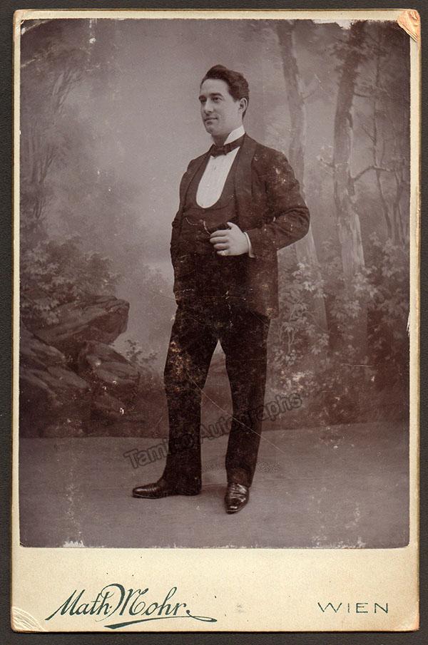 German tenor (1881-1944), creator of the role of Aegisthus in Elektra (opera by Richard Strauss) in the world premiere of 1909. Unsigned cabinet photo, shown possibly in role, Photo by Matthias Mohr photography studio, Vienna. Size is 4.25 x 6.5 inches, in excellent condition