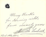 Famous Polish coloratura soprano (1858-1935), signed card, dated in 1902. Written in English with very clear handwriting and signature. Size is 4.5 x 3.5 inches, with attractive blue seal at top left, in excellent condition. Also included: large attractive unsigned photo, shown in role, blind stamped by photographer Aime Dupont, New York. Size is 4.25 x 6.75 inches, in excellent condition.