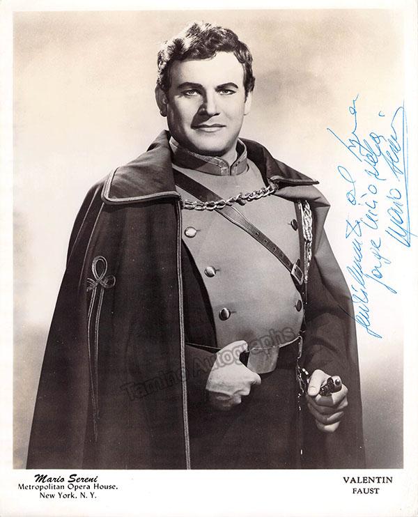 Italian baritone (1928-2015), signed photo, shown as Valentin in Gounod's Faust at the Metropolitan Opera, New York, inscribed. Size is 8 x 10 inches, in excellent condition.