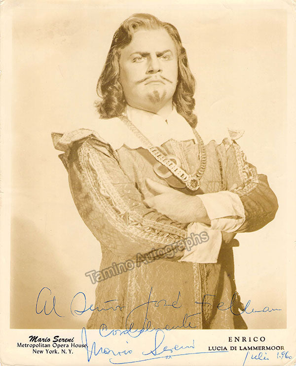 Italian baritone (1928-2015), signed photograph, shown as Ashton in Donizetti's Lucia di Lammermoor at the Metropolitan Opera, New York, inscribed and dated in 1960. Size is 8 x 10 inches, small creases on edges, otherwise in good condition.