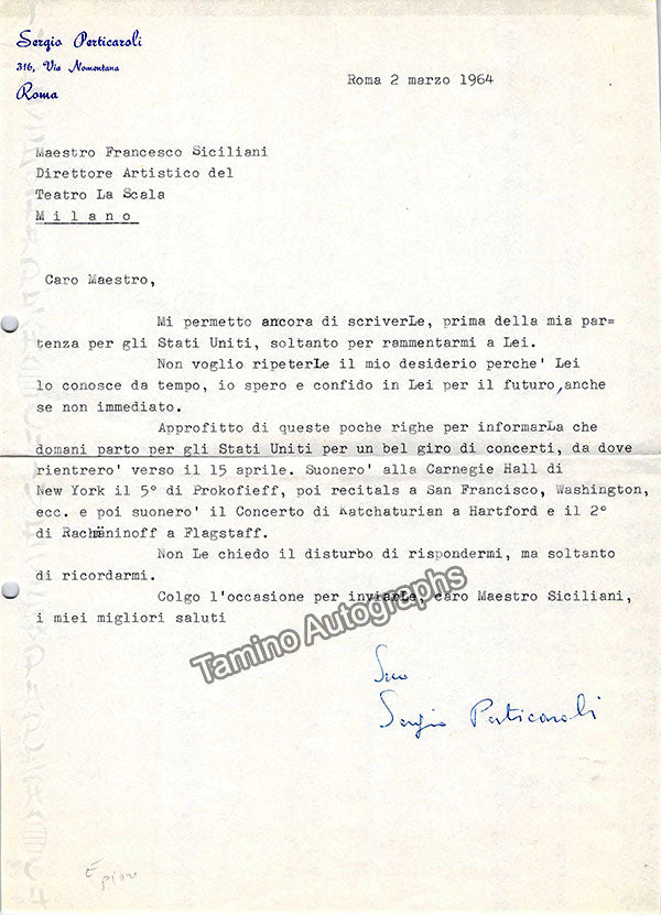 Sergio Perticaroli Autograph Typed Letter Signed 1964