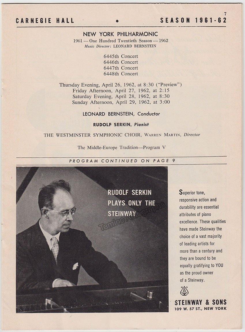 Program for a performance of Beethoven music by the Bohemian-born pianist at Carnegie Hall, New York, in April 1962, with the New York Philharmonic Orchestra conducted by Leonard Bernstein.  Size is 7.25 x 9.7 inches, 18 pages + covers, in excellent condition.