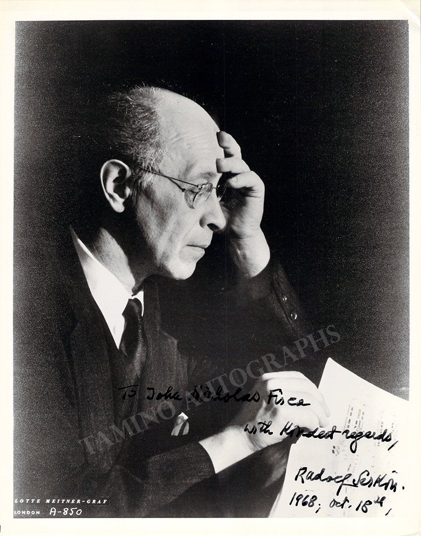 Bohemian-born pianist (1903-1991), one of the greatest pianists of the 20th century. Fine signed photo, inscribed and dated in 1968, shown inspecting a score. Size is 8 x 10 inches, in excellent condition.