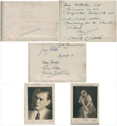 Set of unsigned Bayreuth Weirich postcards of Hans Reinmar (portrait) and Franz Volker (as Siegmund) and signed notes of Franz Volker and Hans Reinmar to Frau Fritsch, including a note with signatures of the family of Franz Volker and Hans Reinmar, also staying in the same guesthouse.