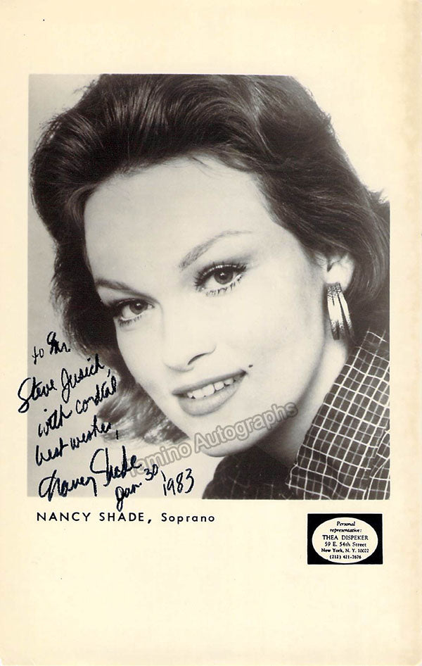 American soprano (b. 1946), signed photograph, shown as herself. Inscribed and dated in 1983. Size is 3.5 x 5.75 inches, in excellent condition.