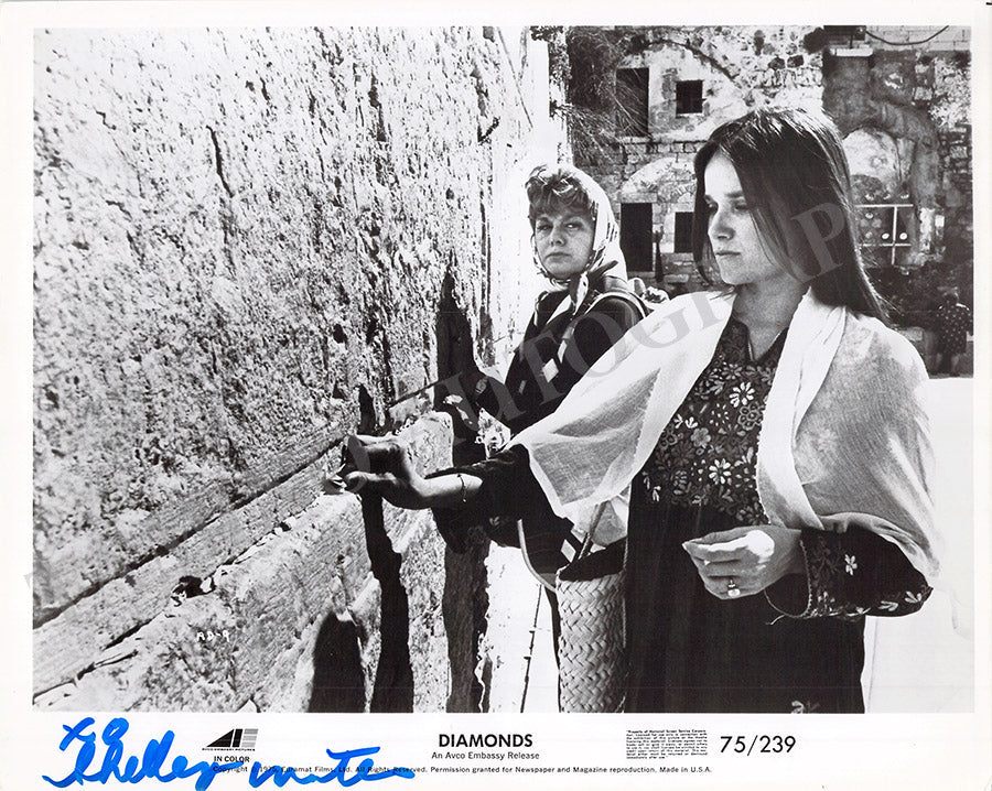 Black-and-white promo movie-still photograph of Menahem Golan's film 'Diamonds' (1975) signed by her, shown next to Barbara Hershey. Size is 10 x 8 inches, in excellent condition.