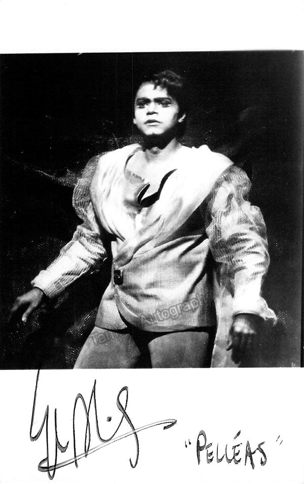 Signed photograph, shown as Pelleas in Debussy's Pelleas et Melisande with Elisabeth Soderstrom as Melisande. Size is 8 x 10 inches, several very small creases, otherwise in excellent condition.