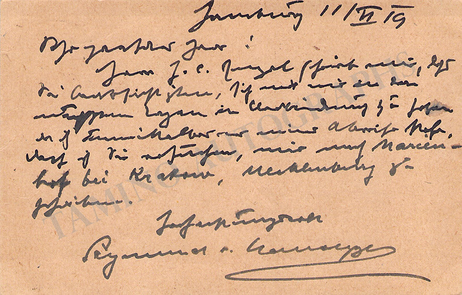 A short note written in German (sold untranslated) on the back of a postcard signed by the composer, dated November 1919. Size is 5.5 x 3.5 inches, in excellent condition.