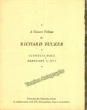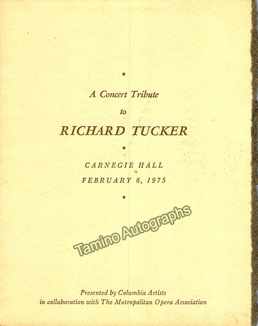 Signed program by several artists, of a concert Tribute to Richard Tucker at Carnegie Hall, in 1975. Size is 6.25 x 8 inches.
