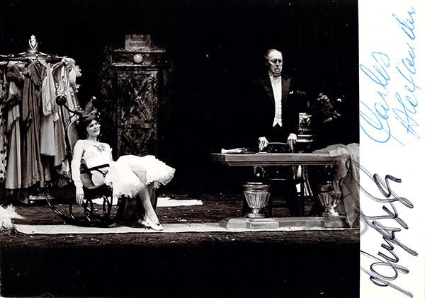 German soprano (b.1940) and German baritone (1915-1991), double signed photo postcard, shown in performance (probably in Lulu). Size is 5.75 x 4 inches