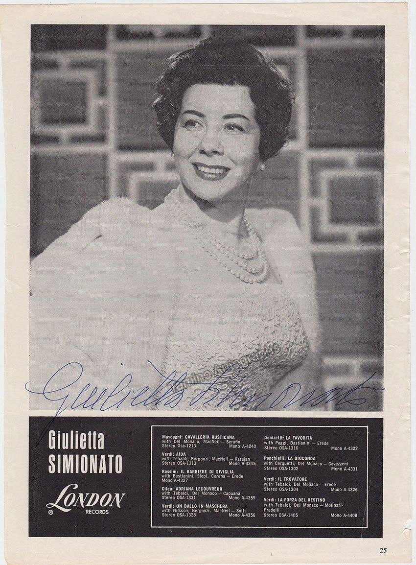 Page from a Metropolitan Opera program advertising the mezzo-soprano's London Records, signed by her under her half-tone image.  Size is 7.9 x 10.8 inches, minor damage on the borders, otherwise in excellent condition.