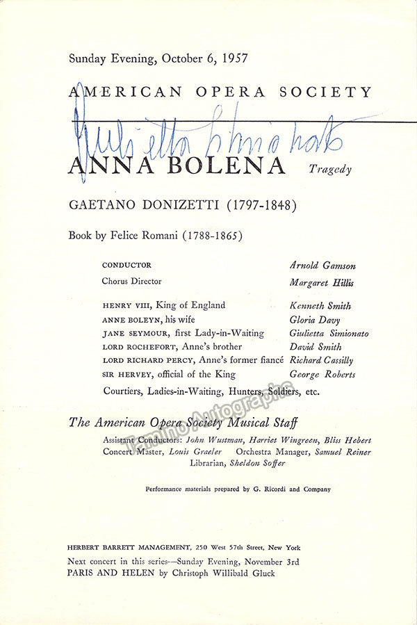 Italian mezzo-soprano (1910-2010), signed program for a performance of Donizetti's Anna Bolena presented by the American Opera Society at the Metropolitan Museum of Art in New York in 1957. Signature is on the cast page. 4 page program, each page is 6 x 9 inches, in excellent condition.