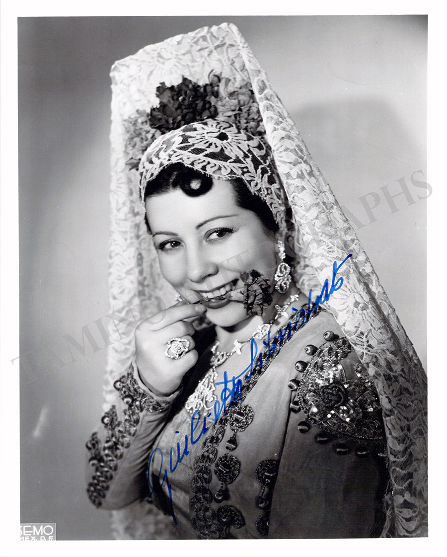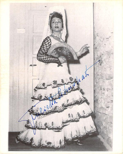 Beautiful black-and-white photograph signed by her, shown in costume in the title role of Bizet's opera Carmen. Size is 7.9 x 10 inches, in excellent condition.