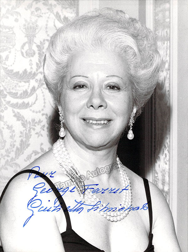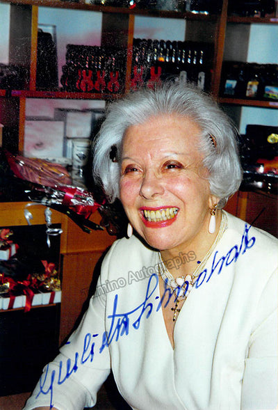 Signed photograph, shown as herself, inscribed. Stamped on verso by photographer Massimo Bianchi, Milan. Size is 7 x 9.5 inches, in excellent condition.