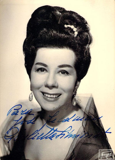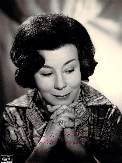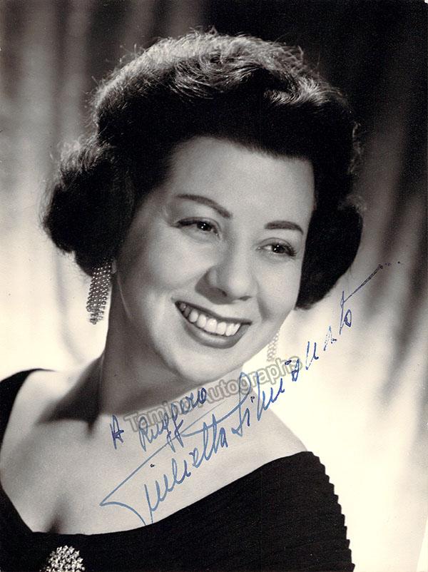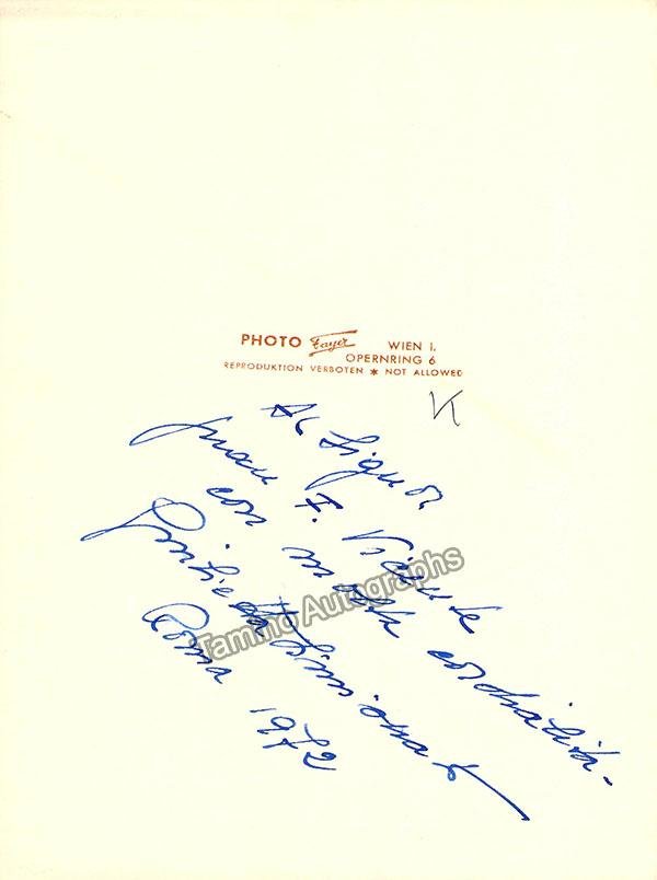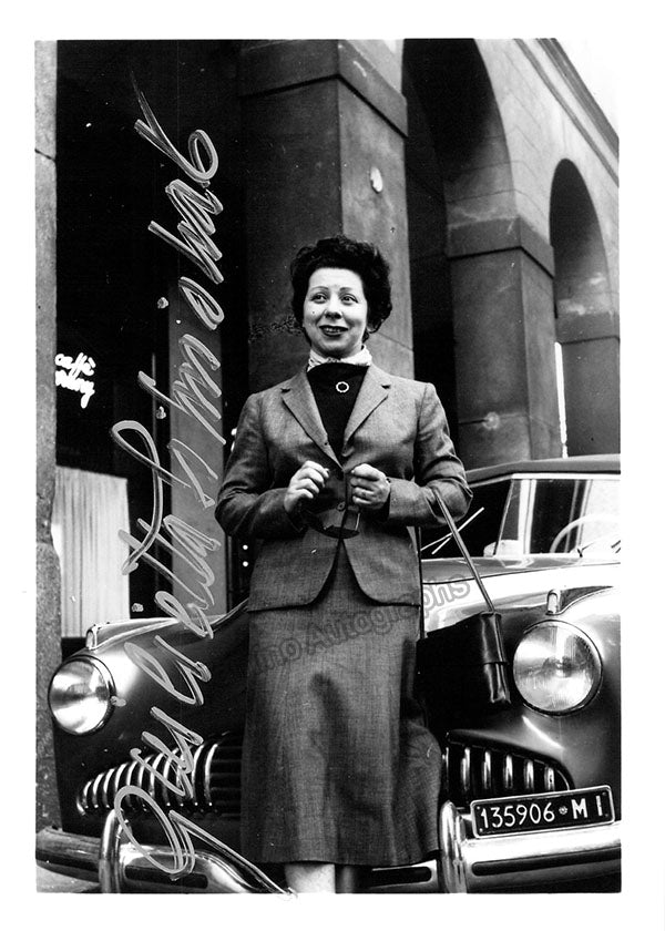 Signed publicity photograph, shown as herself in retirement, inscribed. Photo by Liverani, Milan. Size is 7 x 9.5 inches, in excellent condition.