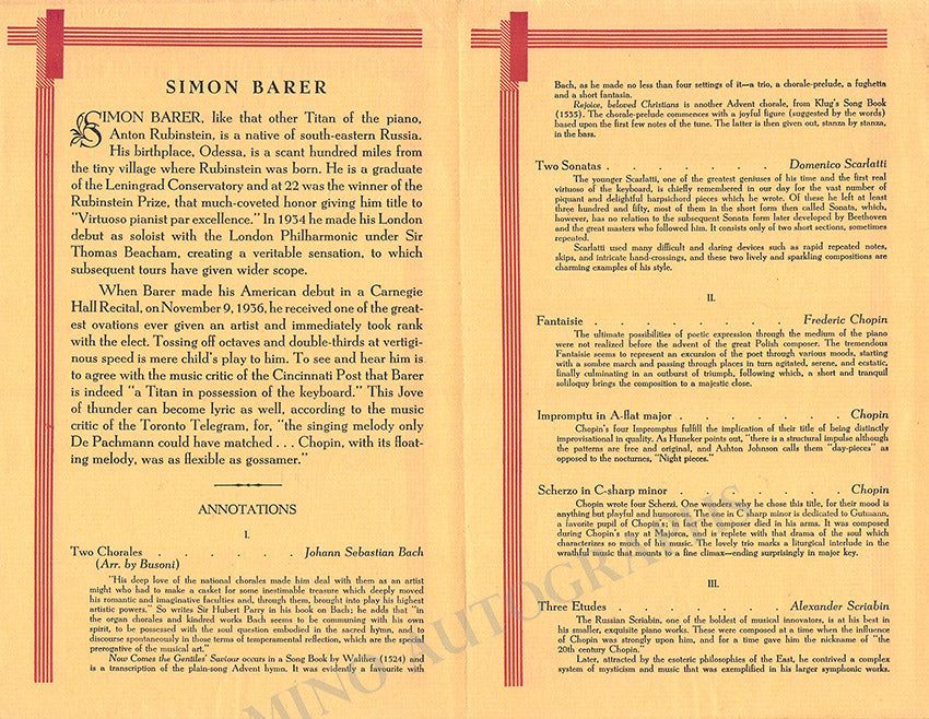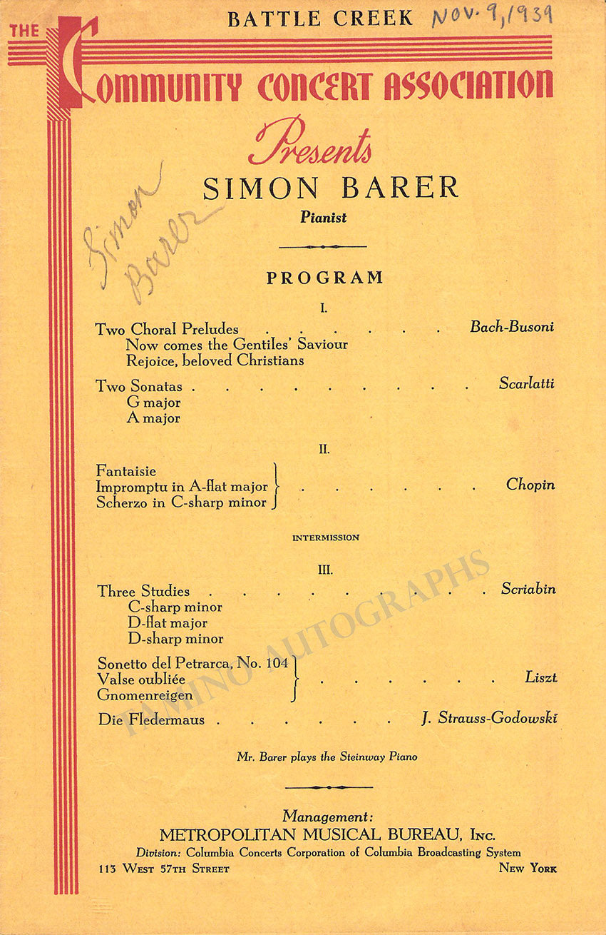Barer, Simon - Signed Program New York 1939 Barer, Simon - Signed Program New York 1939 Barer, Simon - Signed Program New York 1939
