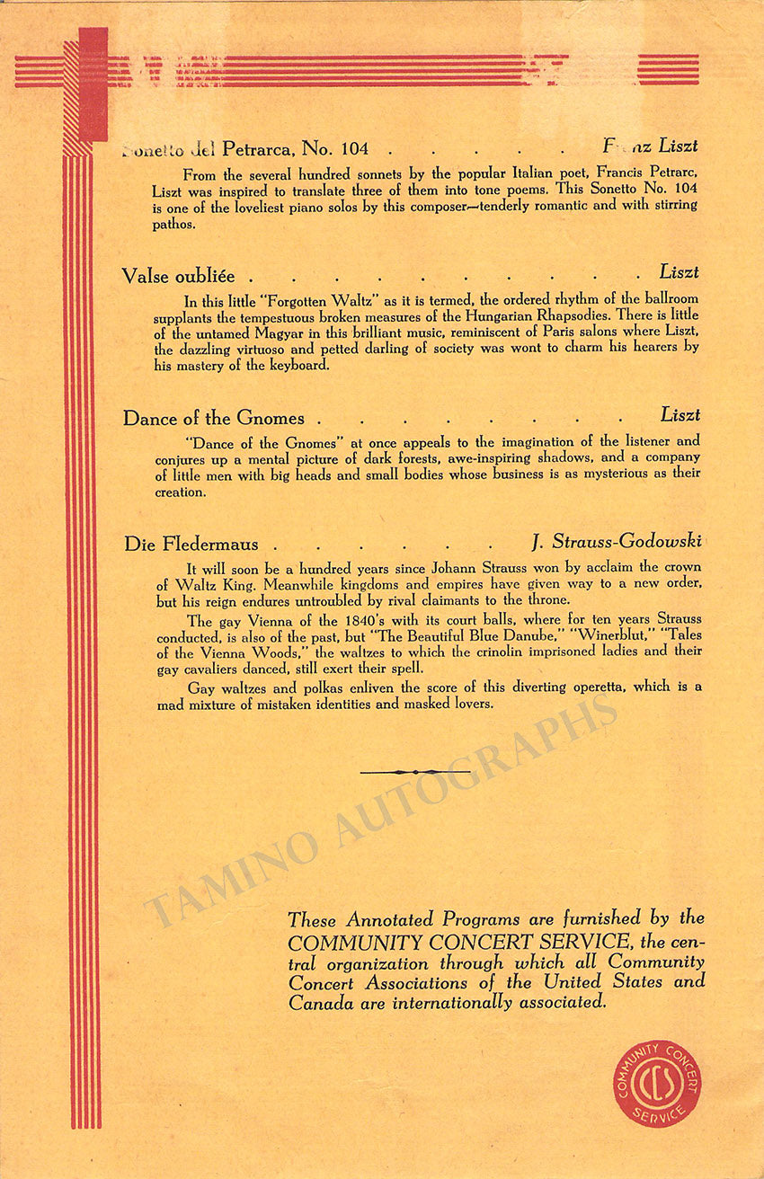Program for a recital of works by Bach, Chopin, Liszt, and others by the Russian pianist in New York, on November 9, 1939, at The Community Concert Association, signed by him in pencil on the program page.