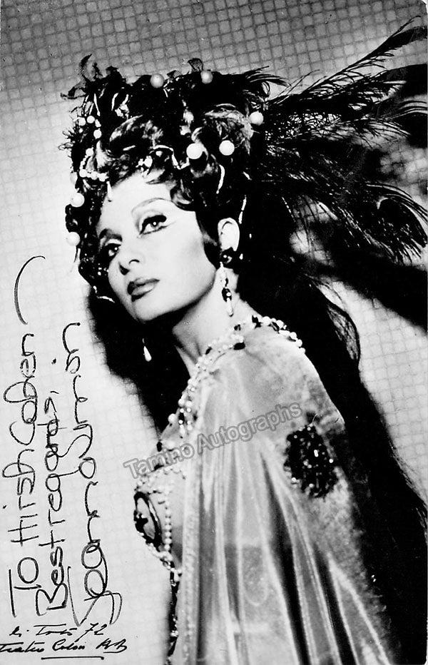 American mezzo-soprano (b. 1940), sister of famed pop singer Carly Simon, had an operatic career for over two decades. Signed postcard photograph, shown in role, inscribed at the Teatro Colon, Buenos Aires, dated in 1972. Size is 3.5 x 5.5 inches, in excellent condition.