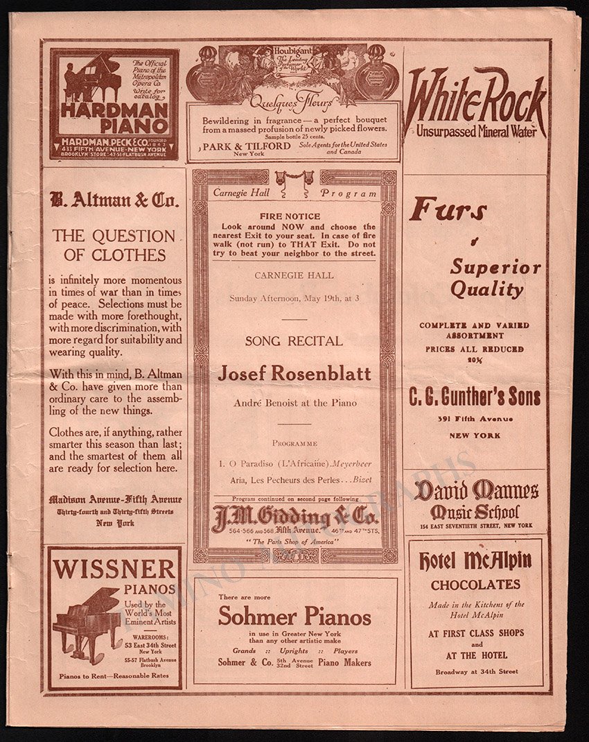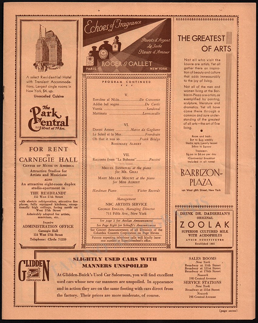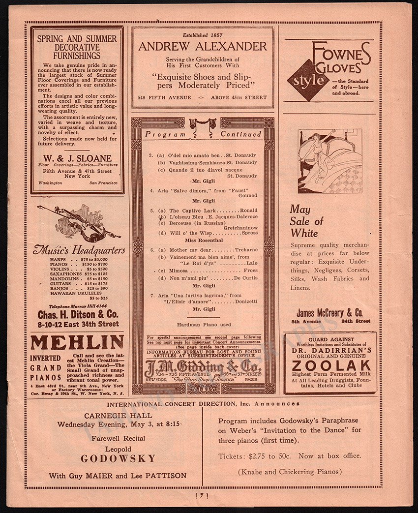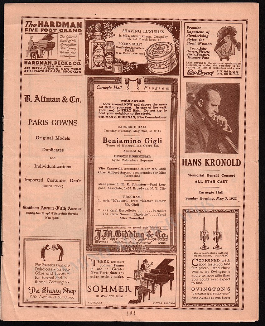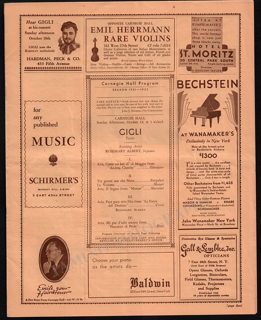 Group of 6 programs for recitals at Carnegie Hall, New York. Artists include Anna Case, Arthur Hackett, Grace Kerns, Josef Ronsenblatt, Beniamino Gigli, Allen McQuhae. Each one is 9.25 x 11.5 inches, in very good condition.