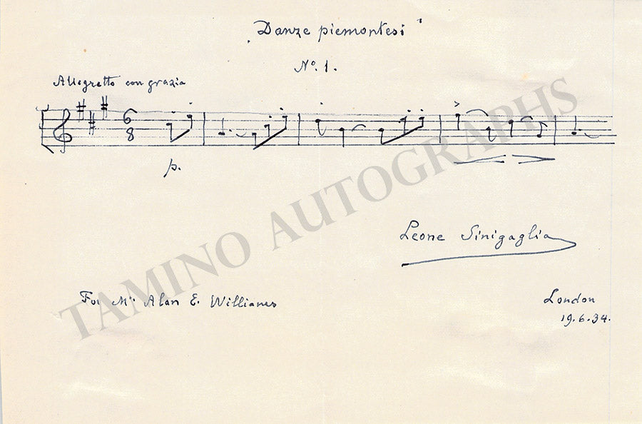 Italian composer (1868-1944), autograph music quote signed, inscribed and dated in London in 1934. Bold handwriting and signature. Size is 4.25 x 6.5 inches, small folds and mounting traces on verso, otherwise in excellent condition.