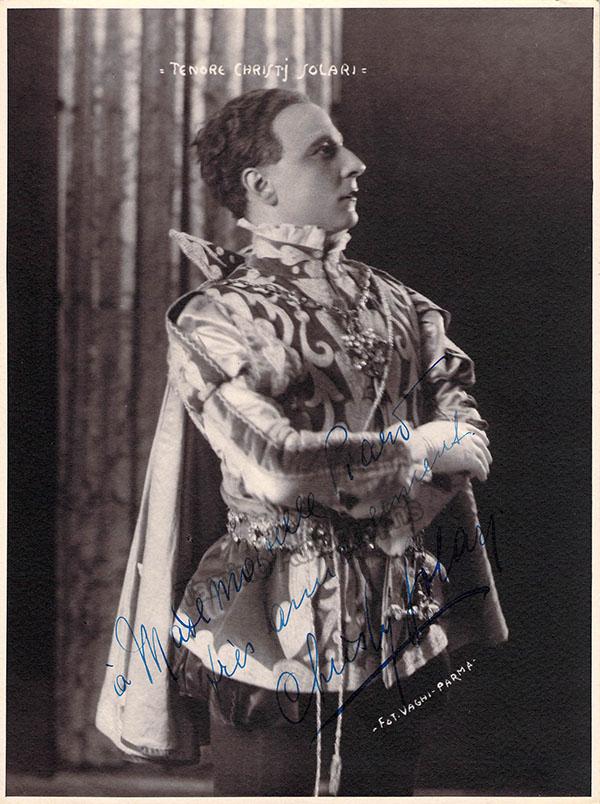 Italian tenor (1884-1974), signed photo, shown in role (possibly the Duke in Verdi's Rigoletto), inscribed. Photo by Vaghi, Parma. Size is 6.75 x 9.25 inches, small spot on verso, otherwise in excellent condition.