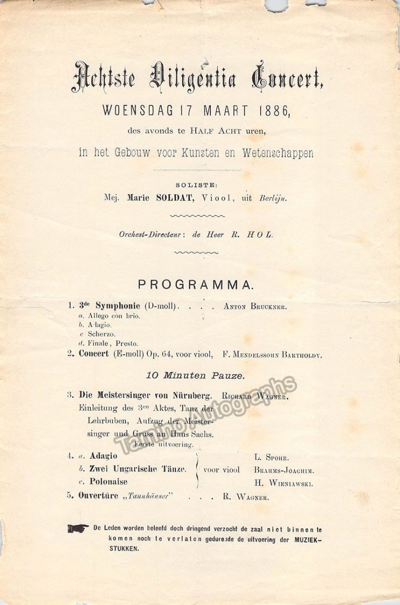 Program for a performance by Marie Soldat in Wetenschappen, Holland, March 17th, 1886. One page, 6.5 x 9.75 inches, in good condition.