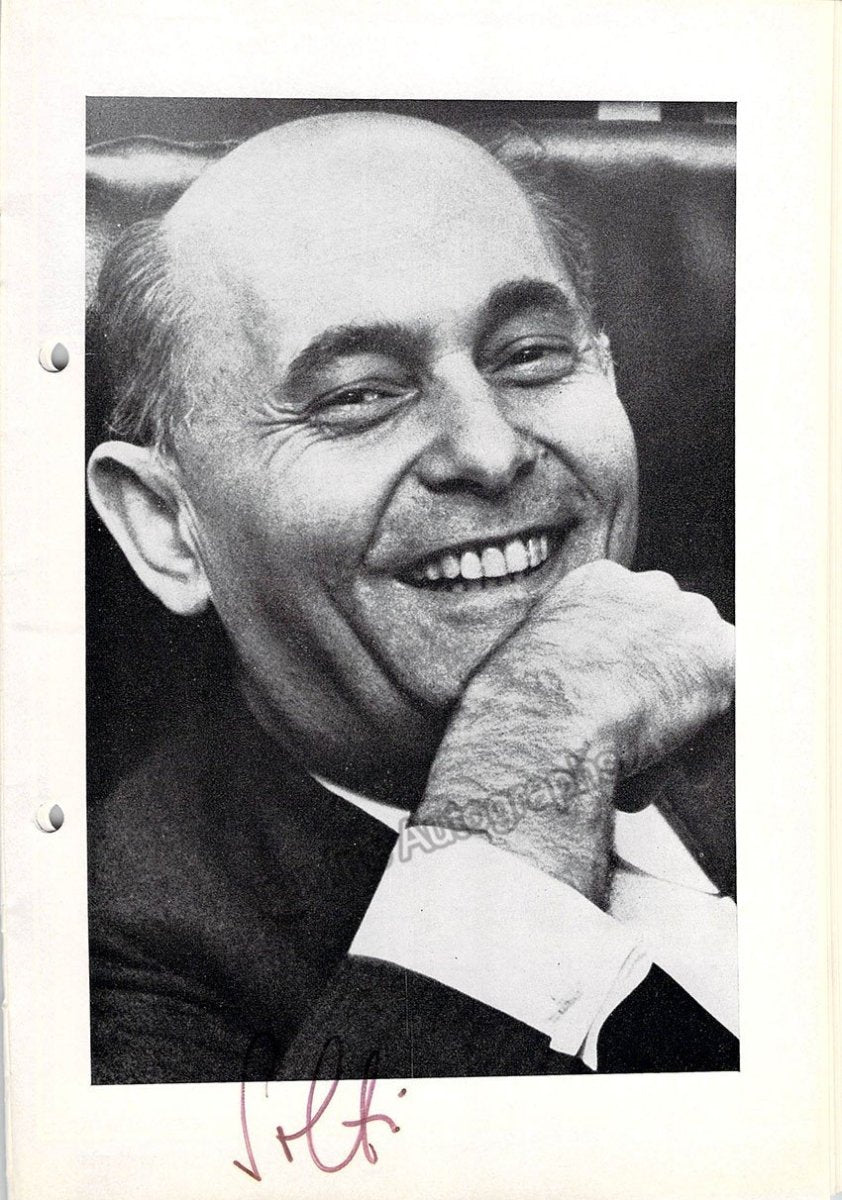 Program for a concert of the London Philharmonic Orchestra in Nuremberg, 1969. Program signed on the photo page. Size is 21 x 14.5 cm, storage holes not affecting picture, otherwise in excellent condition.