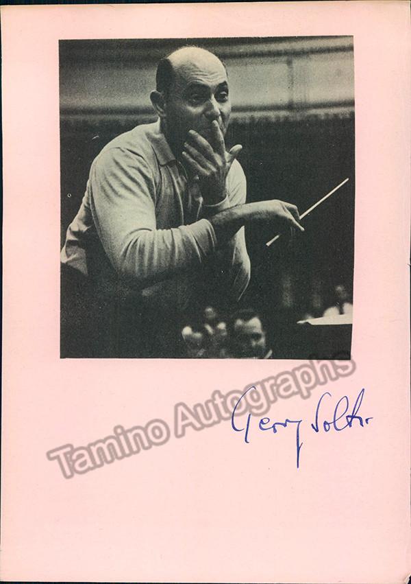 World-renowned hungarian-british orchestral and operatic conductor (1912-1997). Signed cardboard page, with a half-tone photo of the conductor at work, 5.75 x 8.25 inches.