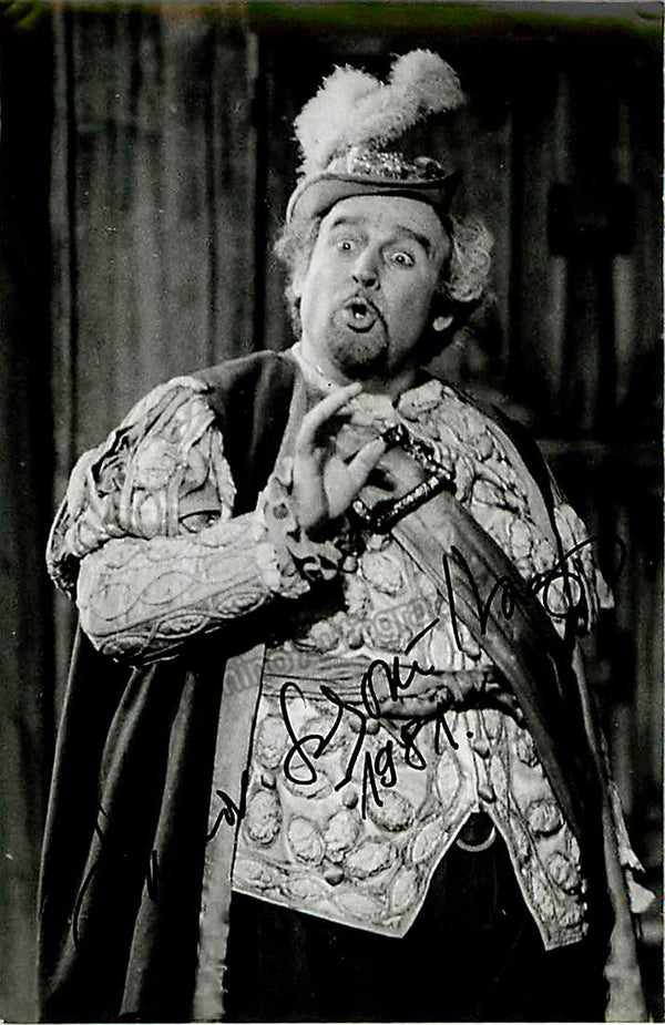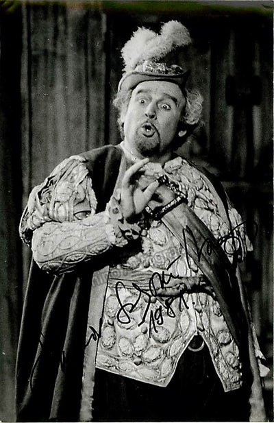 Signed photograph, shown in the title role of Verdi's Falstaff. Stamped on verso by photographer Mezey Bela, Budapest. Size is 3.5 x 5.5 inches.
