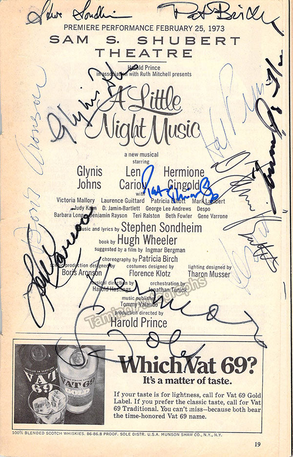 Wonderful full program for a performance of the musical "A Little Night Music", 1973, Sam S. Shubert Theater, New York. Signed on the cast page by Stephen Sondheim over the top left corner, plus 10 artists of the cast - 11 signatures in total. Size is 5.5 x 8.9 inches, full program with all pages and covers, in very good condition.